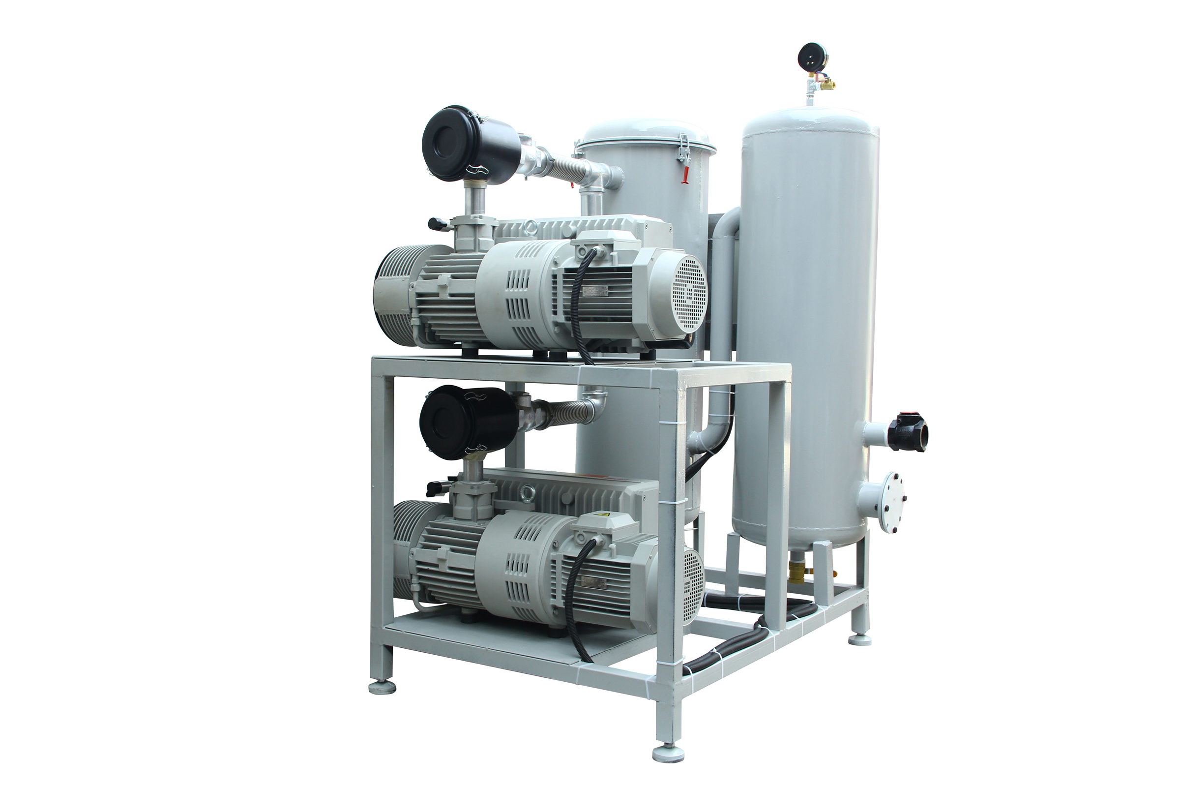 固定式系統一般包括底盤基座、真空泵、真空緩沖罐、控制箱、真空附件(真空閥、真空管道真空過濾器等)、真空度控制系統組成,一般適合抽氣量大,工作條件苛刻等工況例如;3立方真空負壓站,配置2臺302立方真空泵,真空過濾器組,在自動控制模式下瞬間抽氣速度可達上干立方每小時時,遠大于單泵和雙泵直接抽氣的速度。